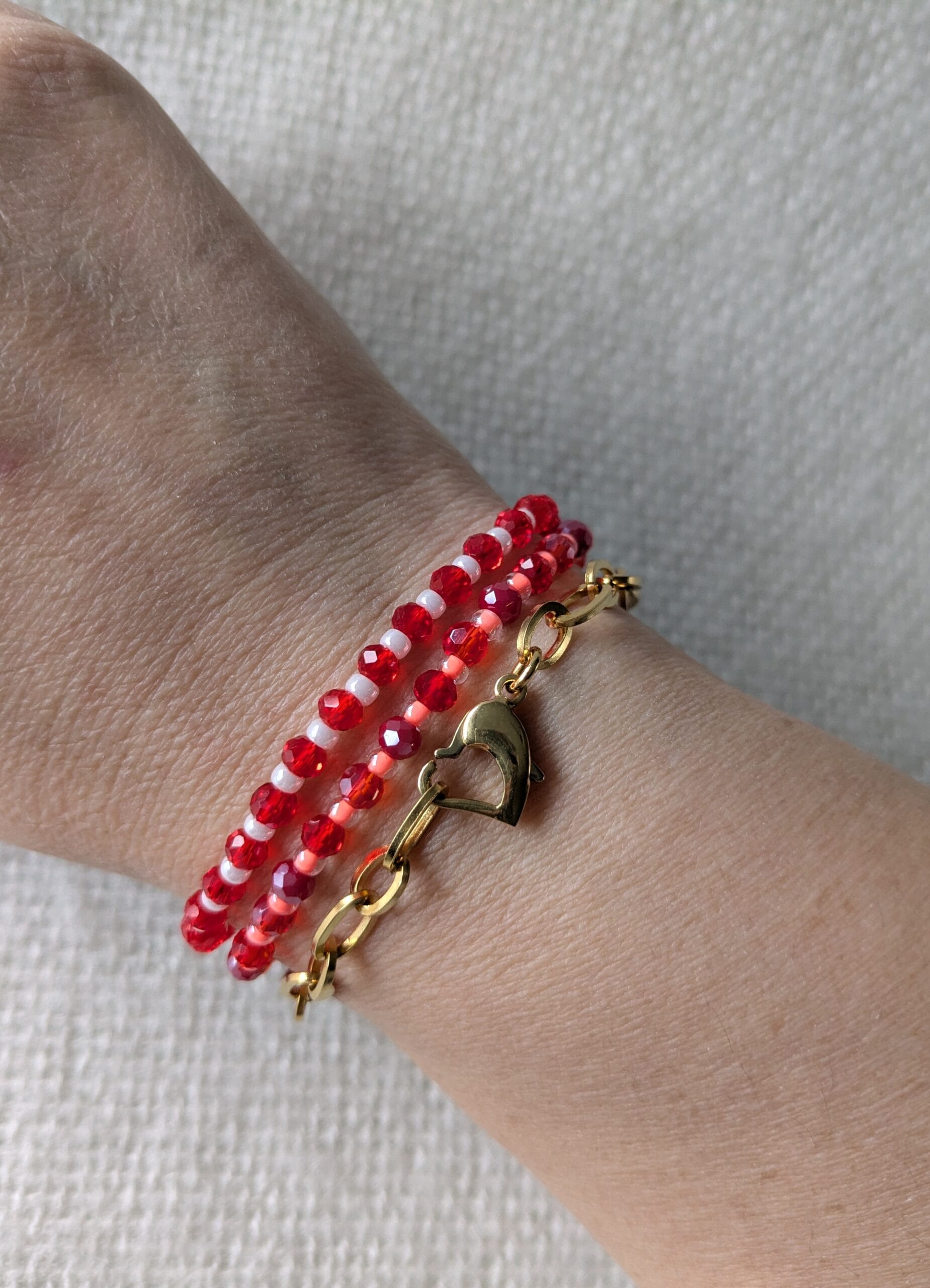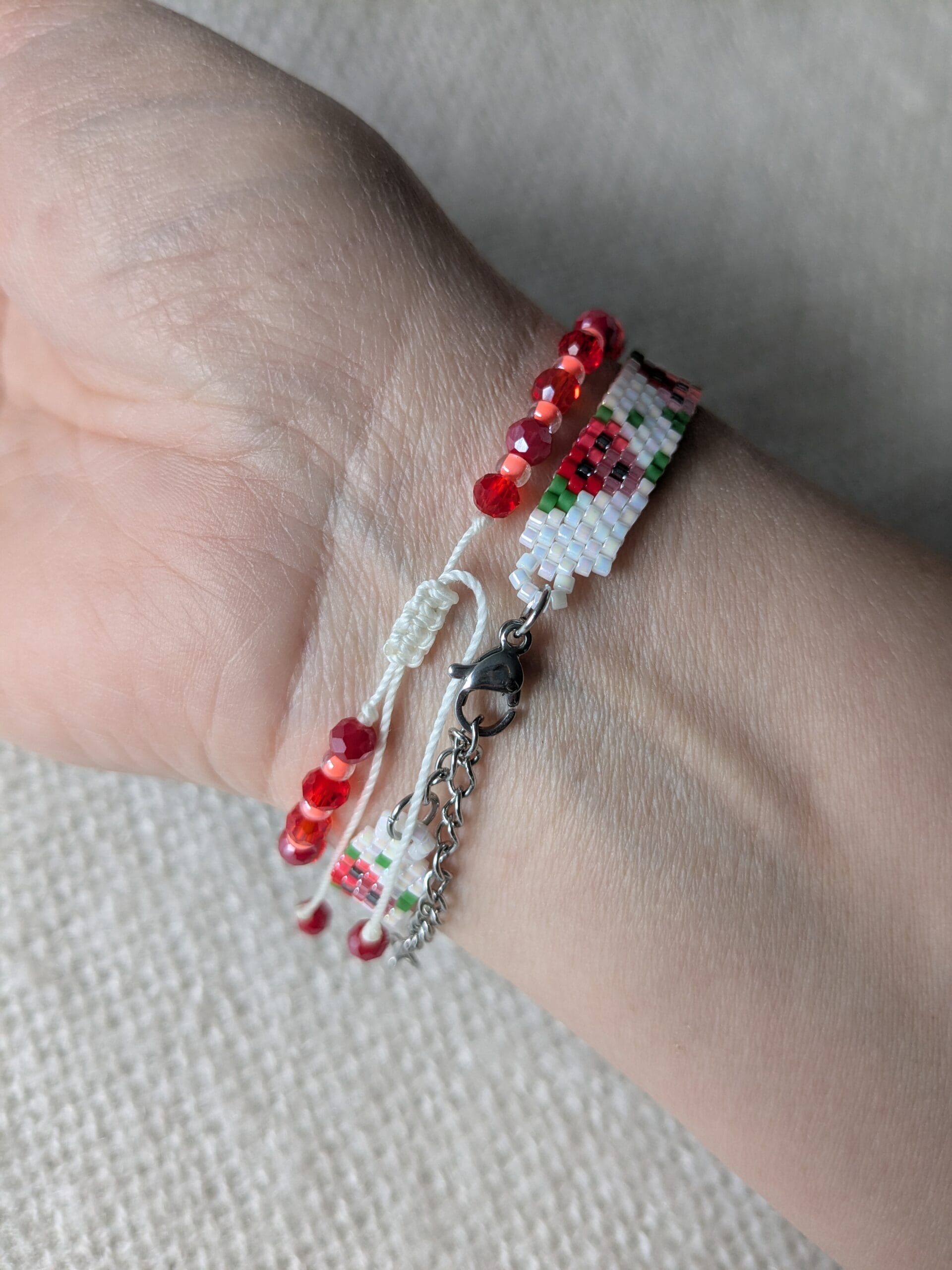 De armband is geregen op C-lon draad en afgewerkt met een schuifknoop, waardoor de armband verstelbaar is.
