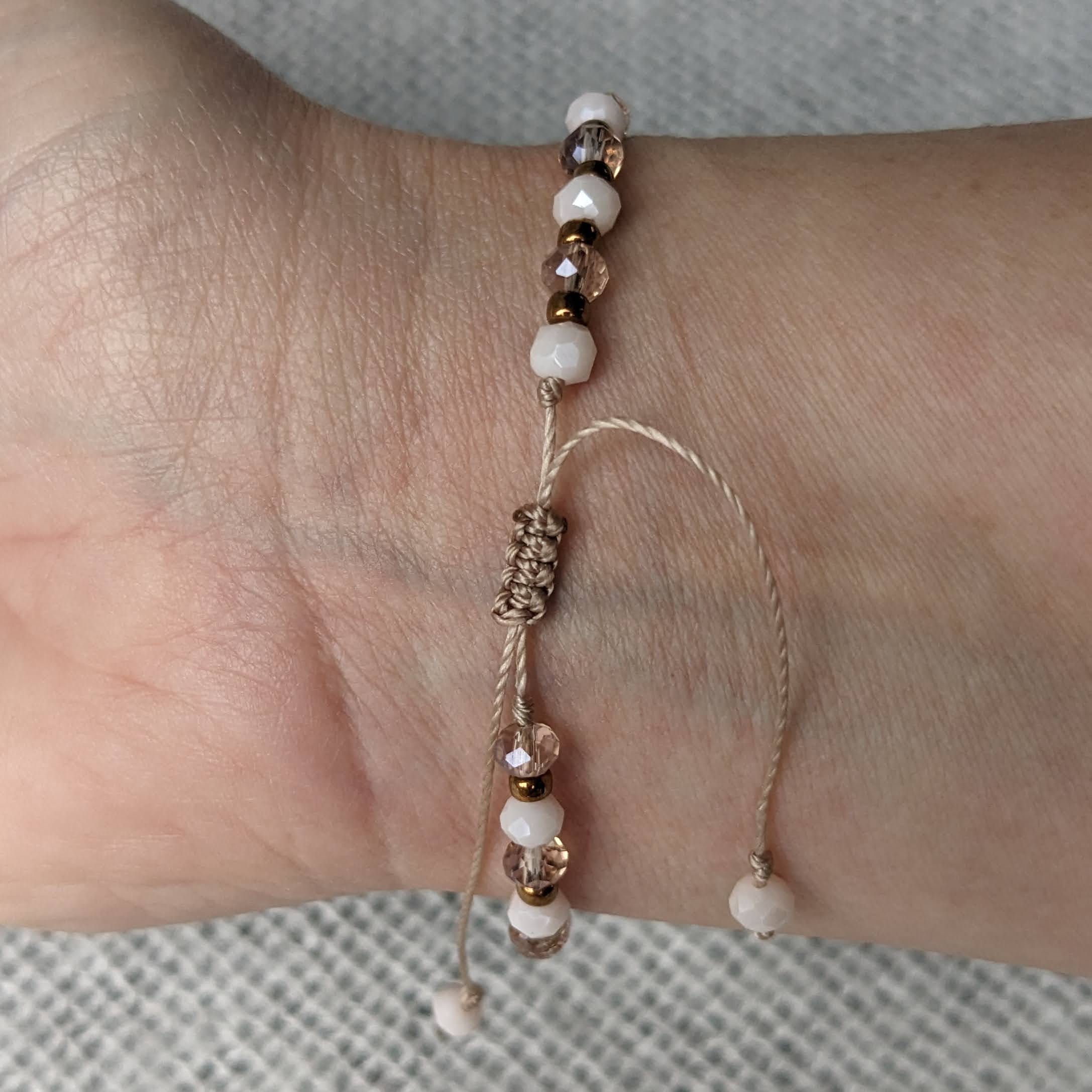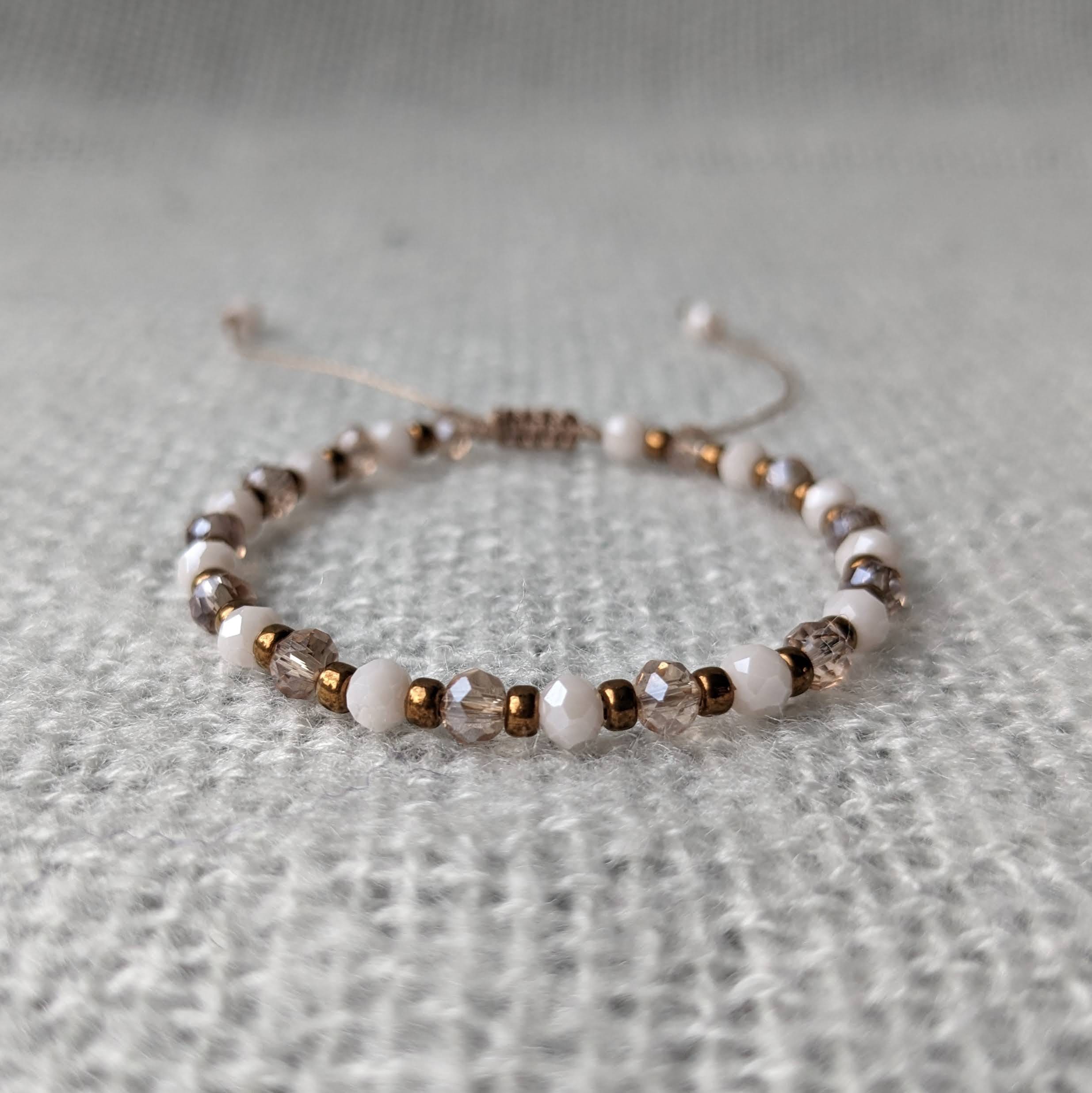 Mooi armbandje gemaakt van glaskralen. Deze armband staat leuk om de pols en is ideaal te combineren met andere armbandjes. De armband is geregen op C-lon draad en afgewerkt met een schuifknoop, waardoor de armband verstelbaar is.