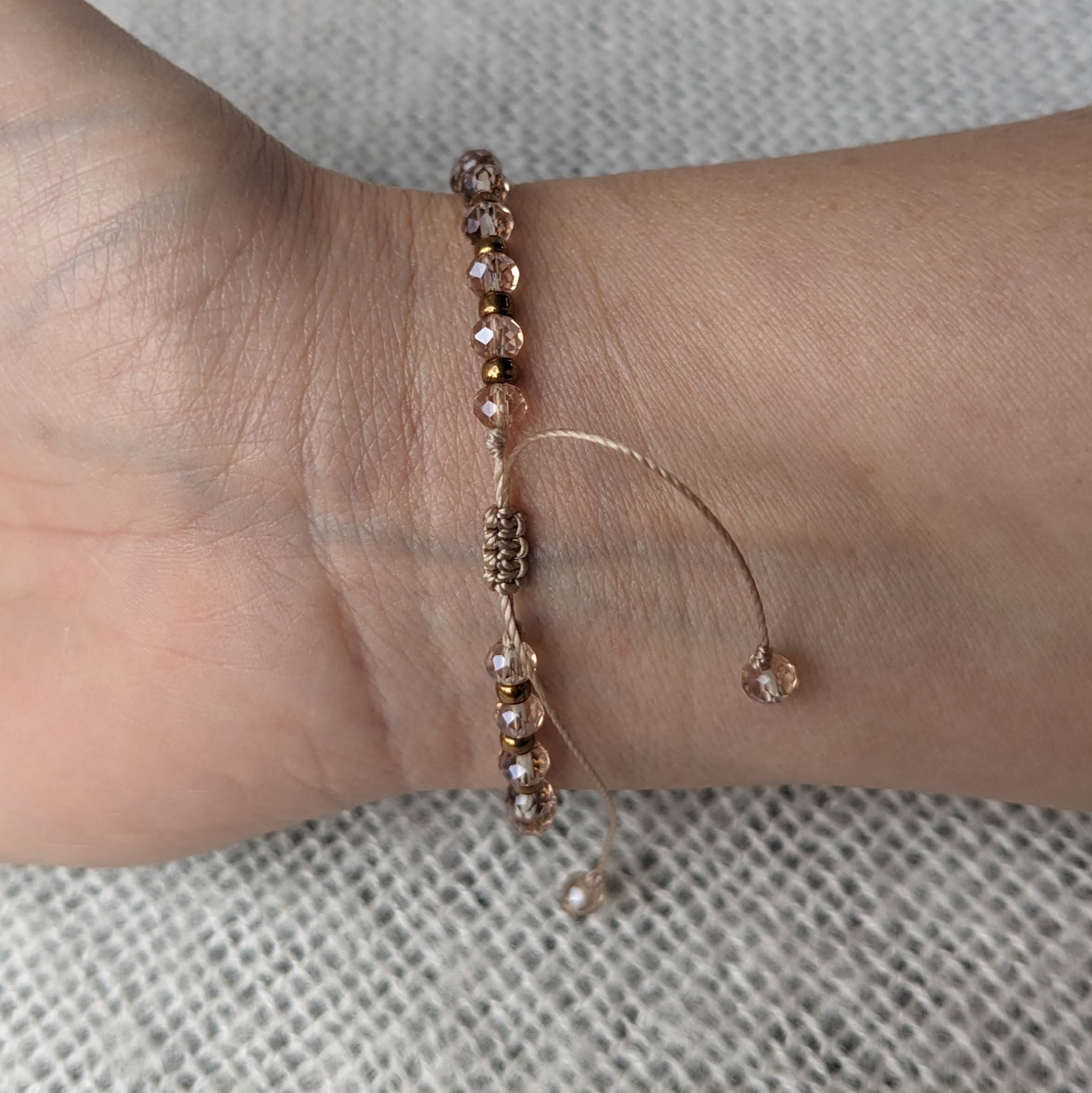 Mooi armbandje gemaakt van glaskralen. Deze armband staat leuk om de pols en is ideaal te combineren met andere armbandjes. De armband is geregen op C-lon draad en afgewerkt met een schuifknoop, waardoor de armband verstelbaar is.