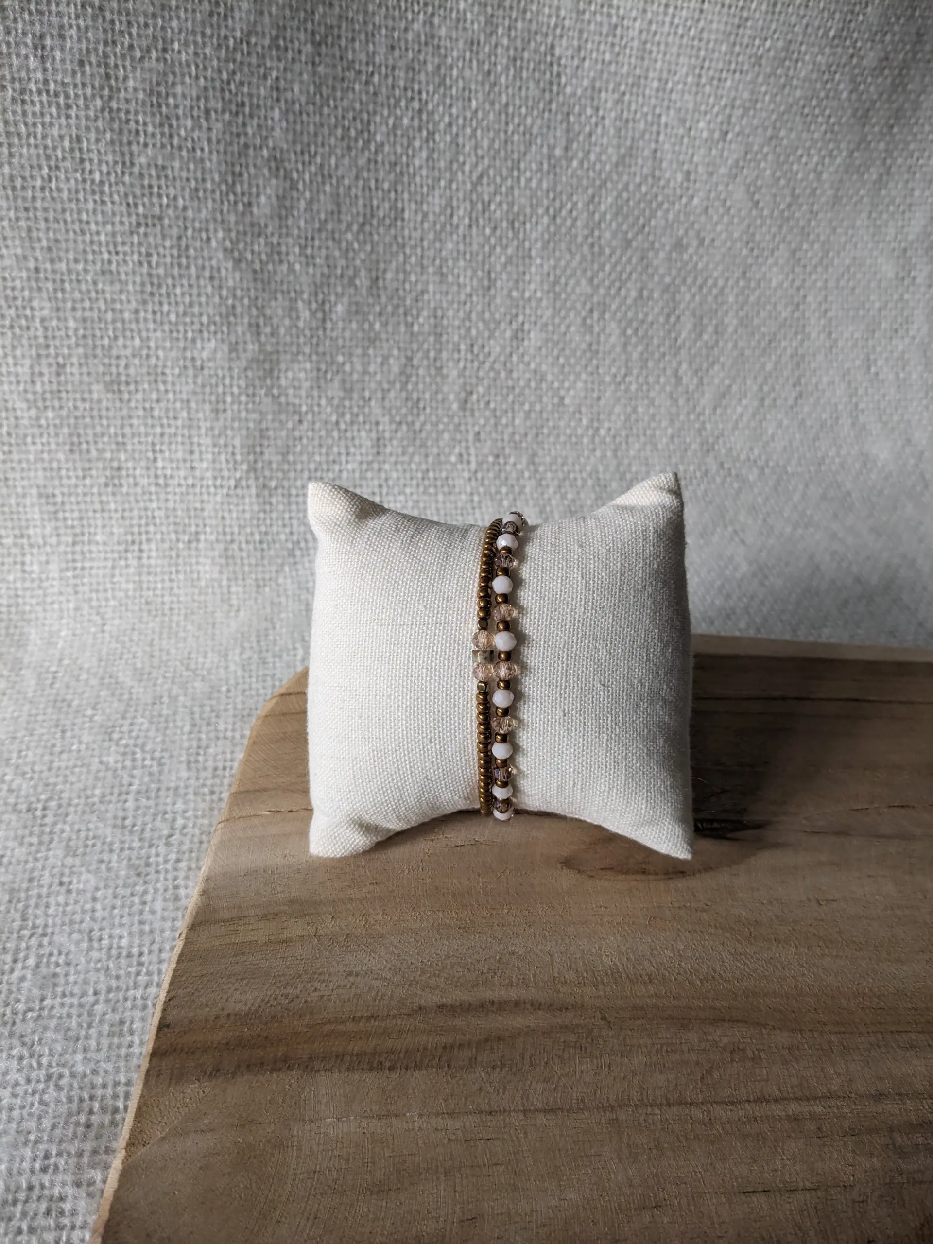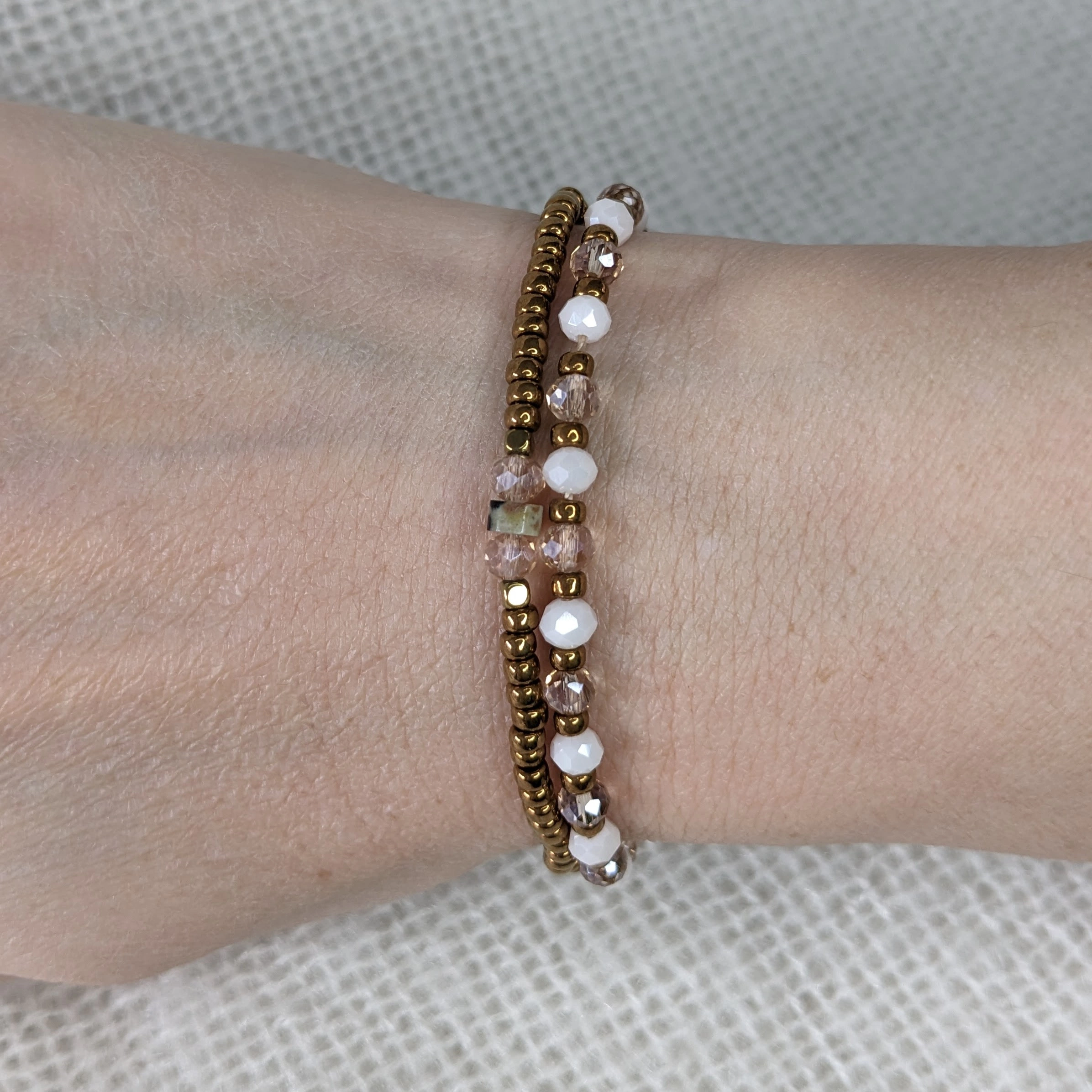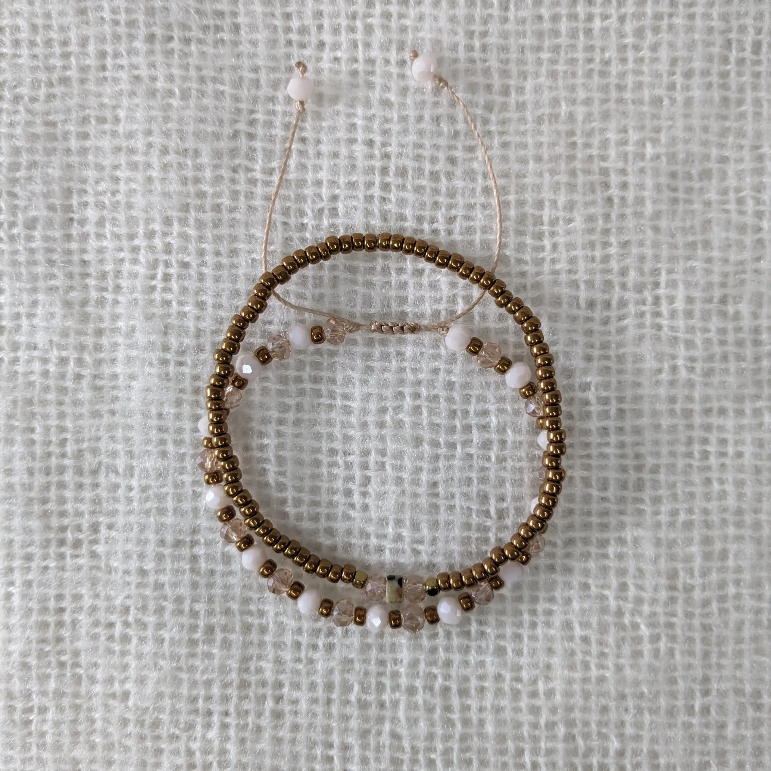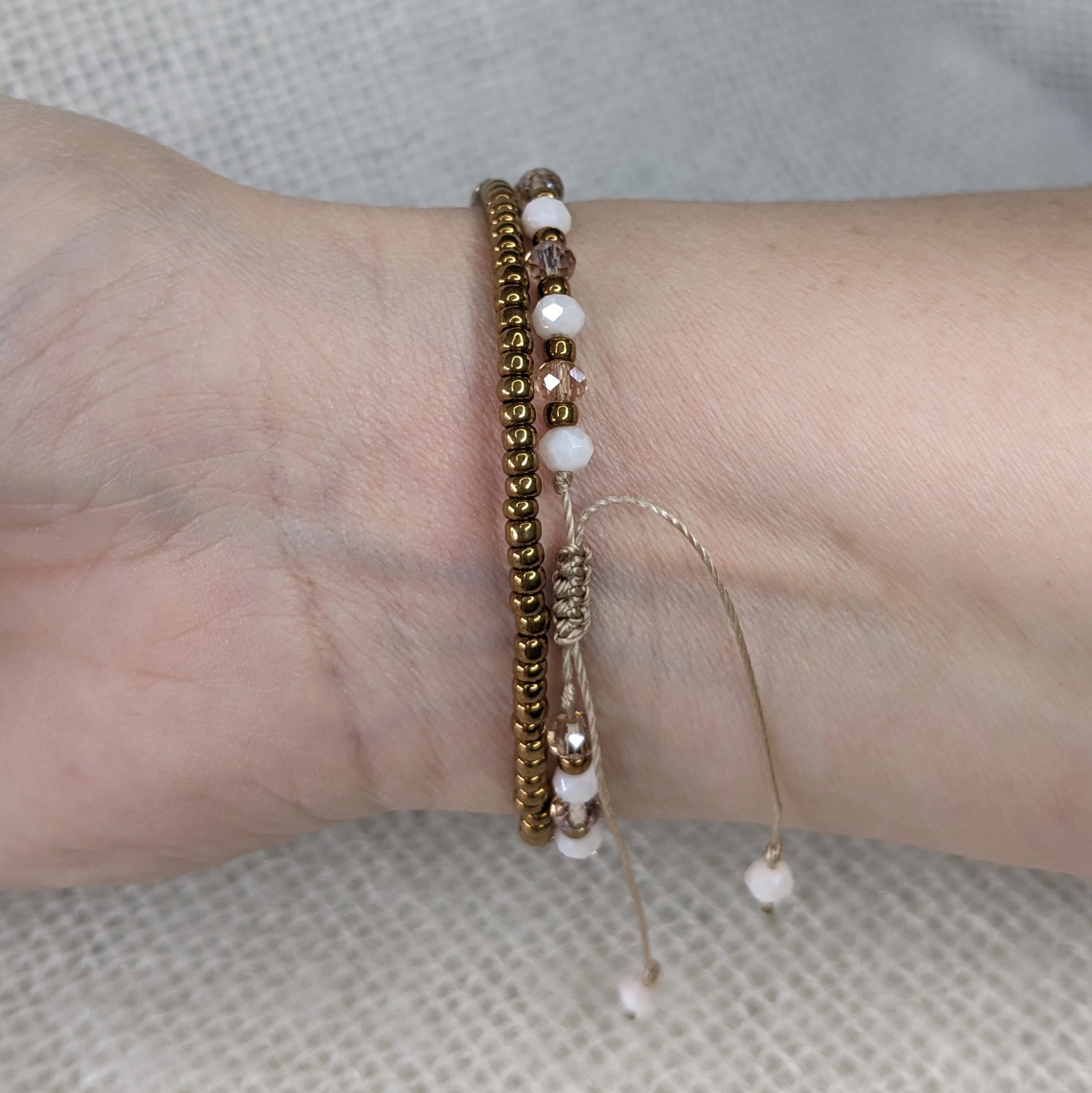 Leuk setje van twee armbandjes. Eén armbandje is geregen op elastiek met miyuki rocailles glaskralen 3 mm. Eén armbandje met facetkralen is geregen op C-lon draad en afgewerkt met een schuifknoop, waardoor de armband verstelbaar is.