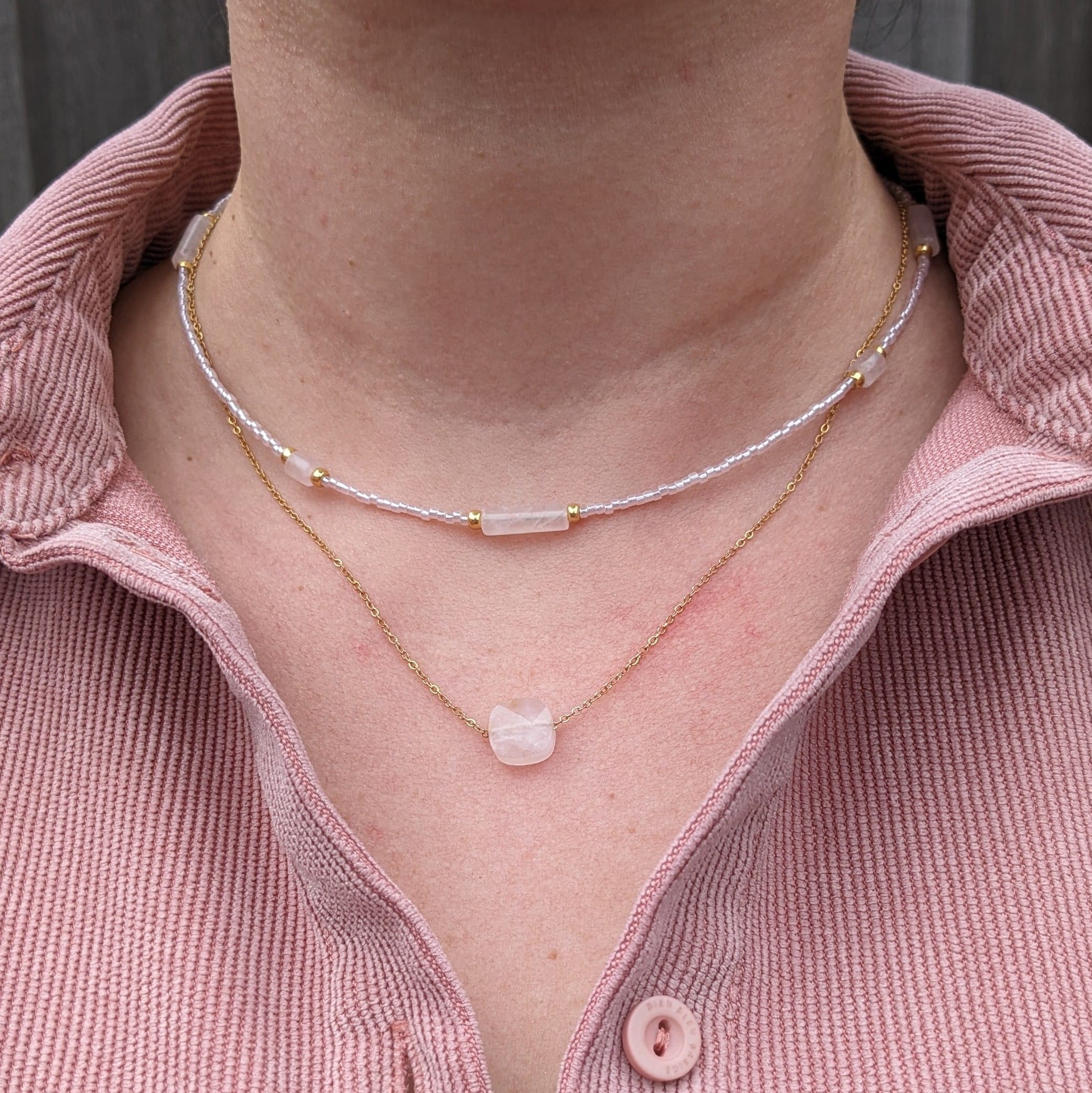 Dit lieflijke en subtiele setje is gemaakt met hele fijne kraaltjes (2 mm) en afgewerkt met natuursteen rozenkwarts. Ik vind dat dit setje de schoonheid van de vrouw versterkt en daardoor gun ik het iedereen om hiermee te kunnen stralen.