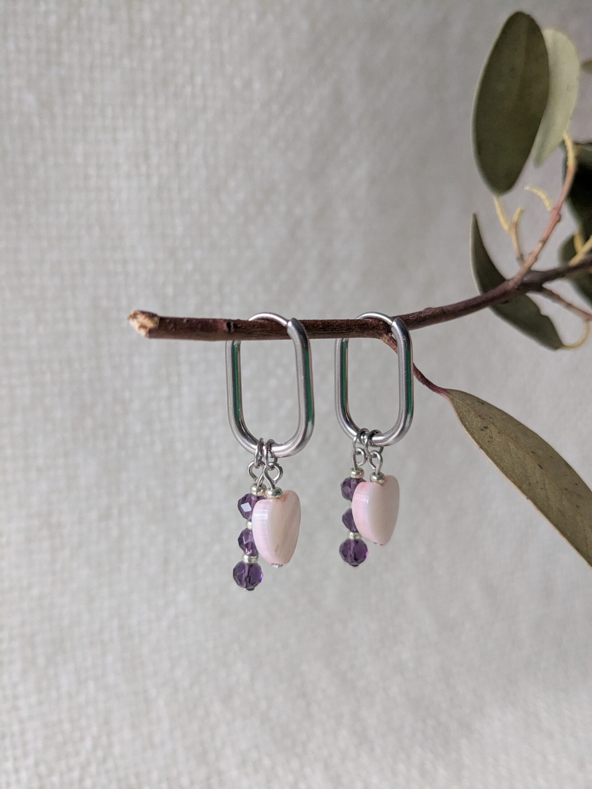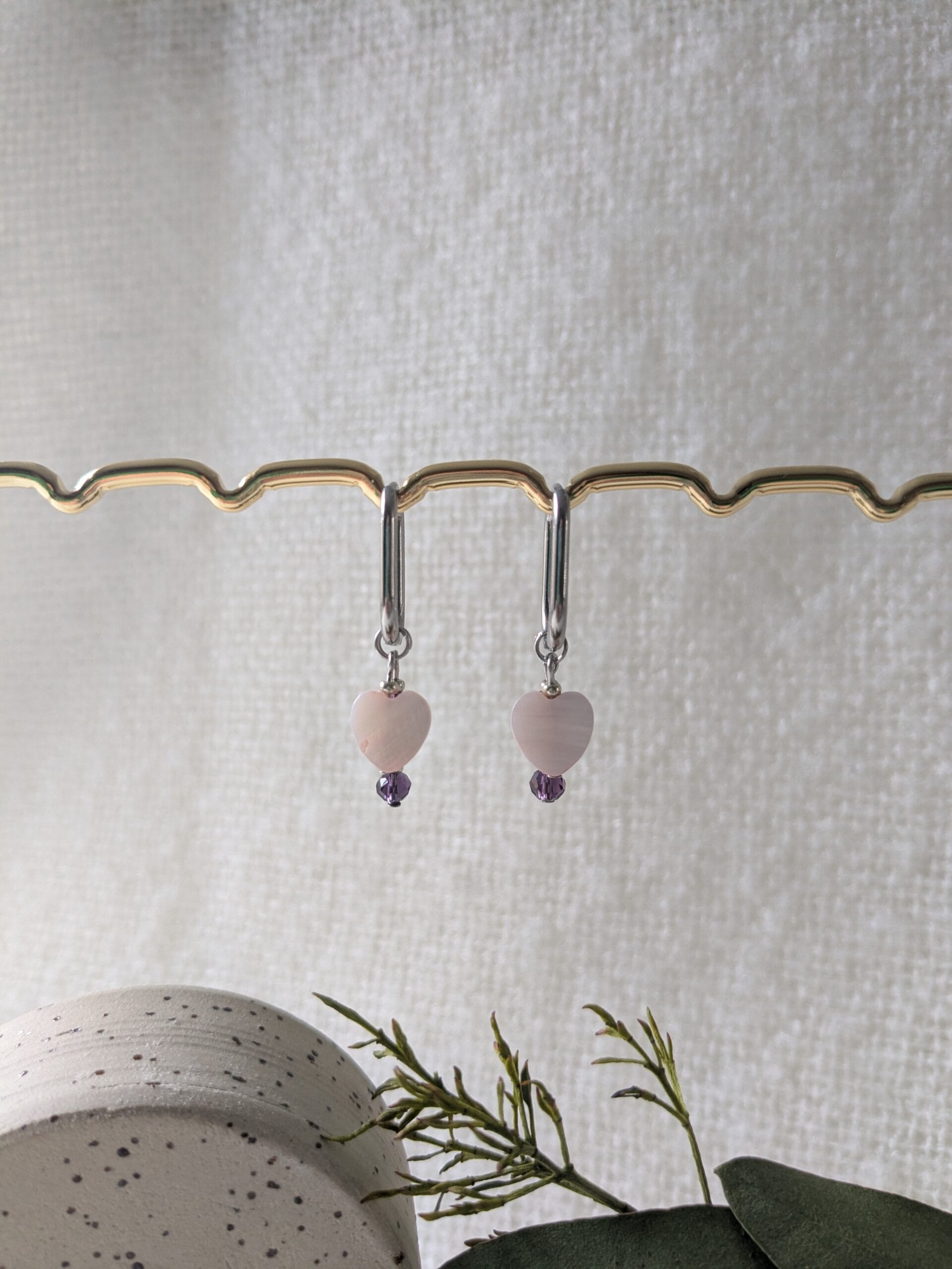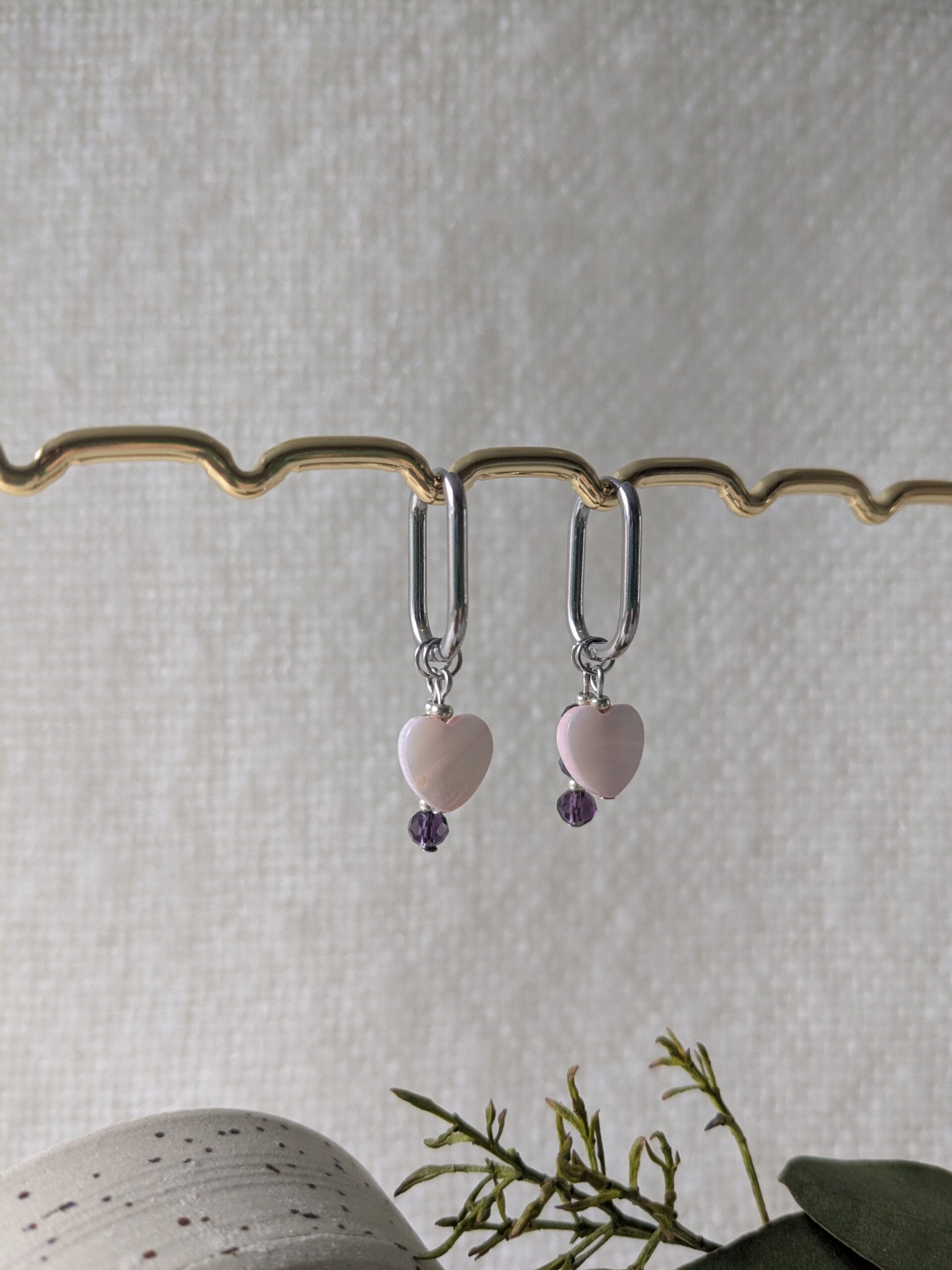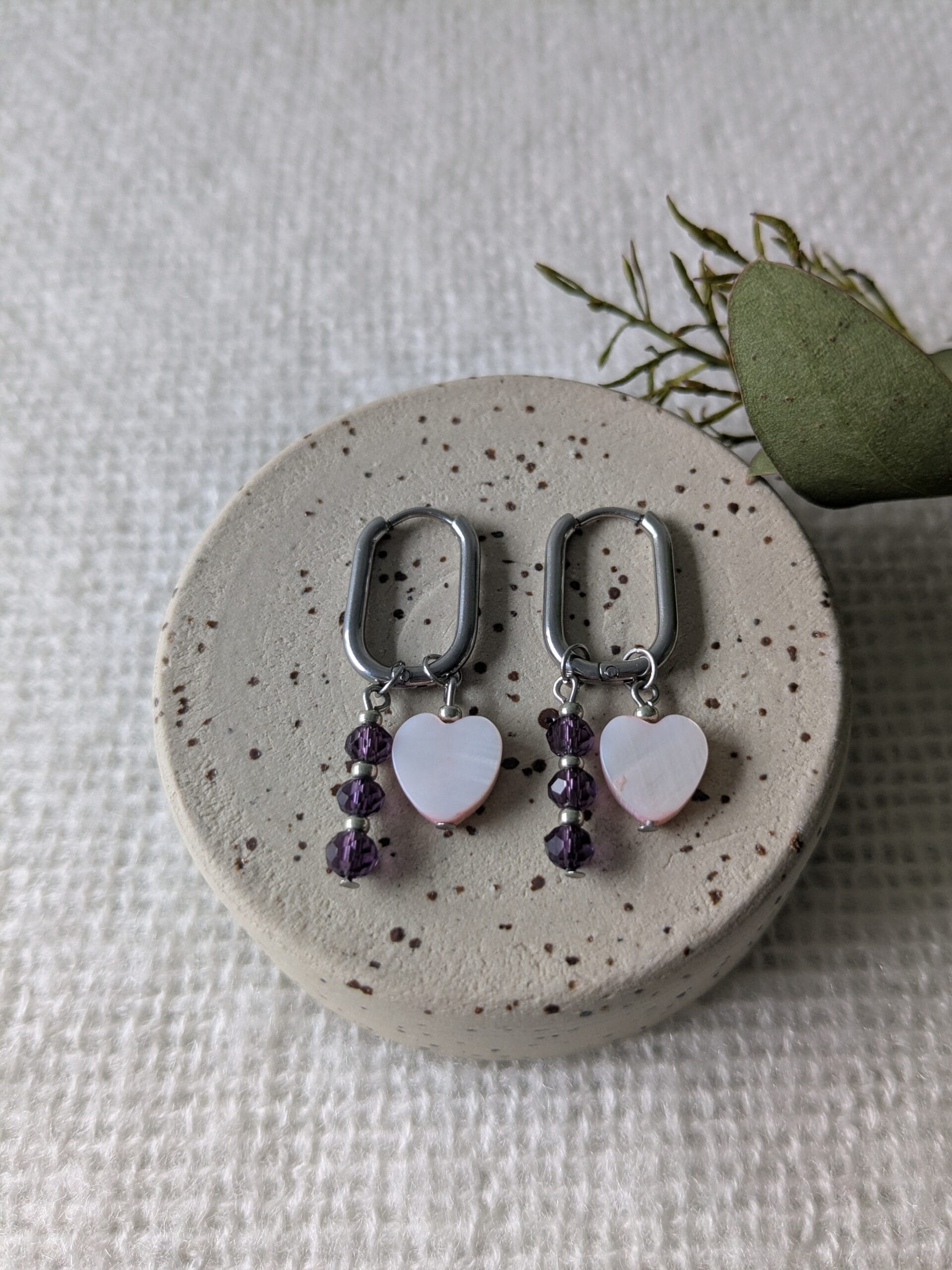 Oorbellen met hangers ‘model roze hart/paars’ (zilver)