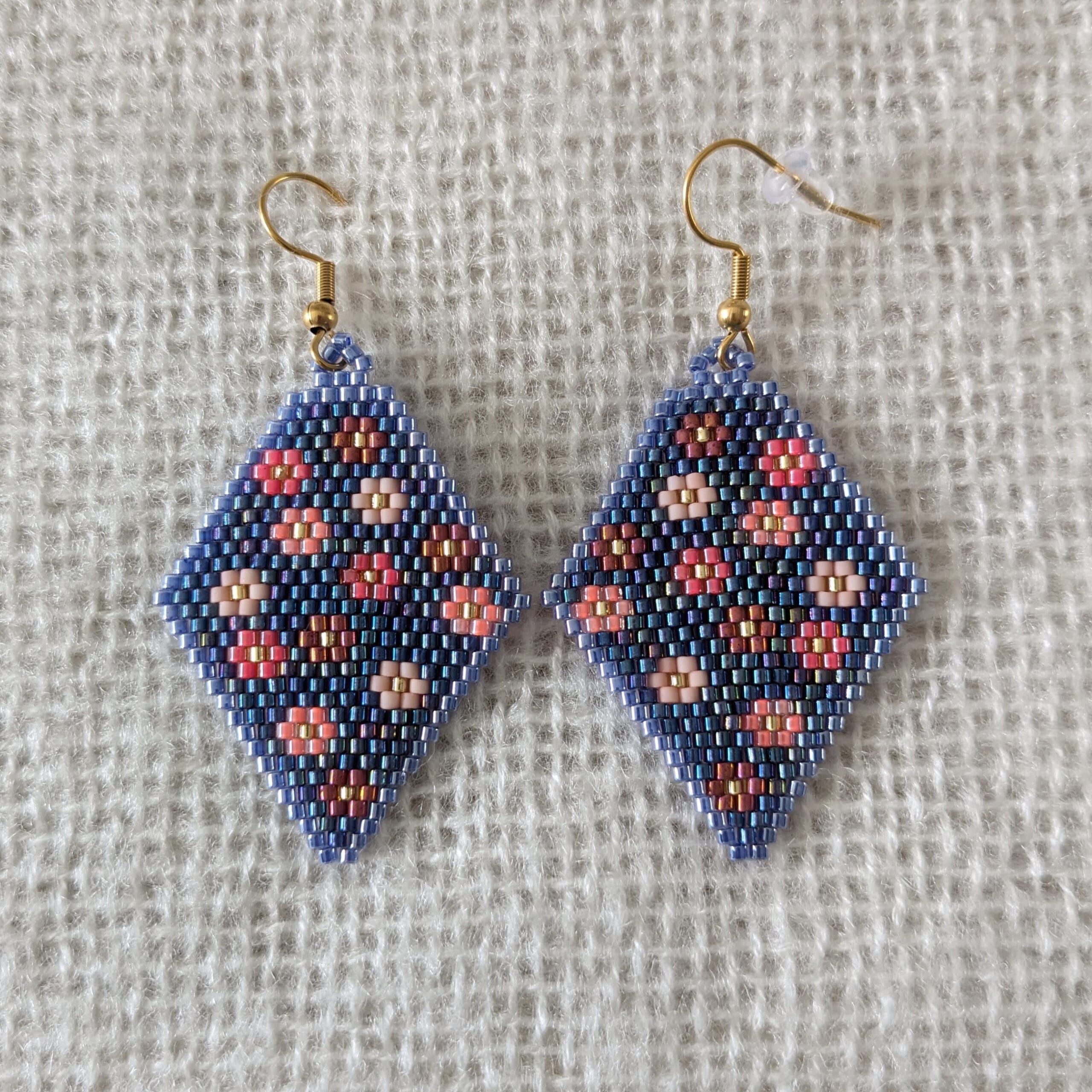 Leuke oorbellen in de kleur blauw, de rand is afgewerkt met een iets lichtere kleur blauw en de bloemetjes zijn in de kleuren oud roze/koraal/zalm. Handgeweven oorbellen gemaakt met de brick stitch techniek. Hierdoor zijn ze uniek in hun soort en mogen ze zeker gezien worden. Ze zijn licht van gewicht, dus fijn om te dragen.