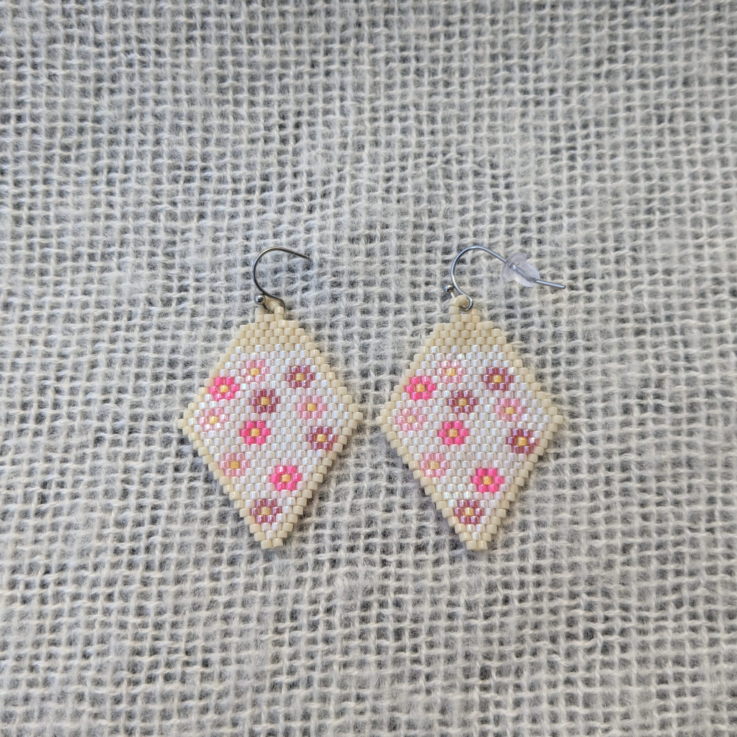Leuke oorbellen in de kleur parelmoer wit, de rand is afgewerkt met een iets donkerder kleur (crème) en de bloemetjes zijn in meerdere tinten roze. Handgeweven oorbellen gemaakt met de brick stitch techniek. Hierdoor zijn ze uniek in hun soort en mogen ze zeker gezien worden. Ze zijn licht van gewicht, dus fijn om te dragen.