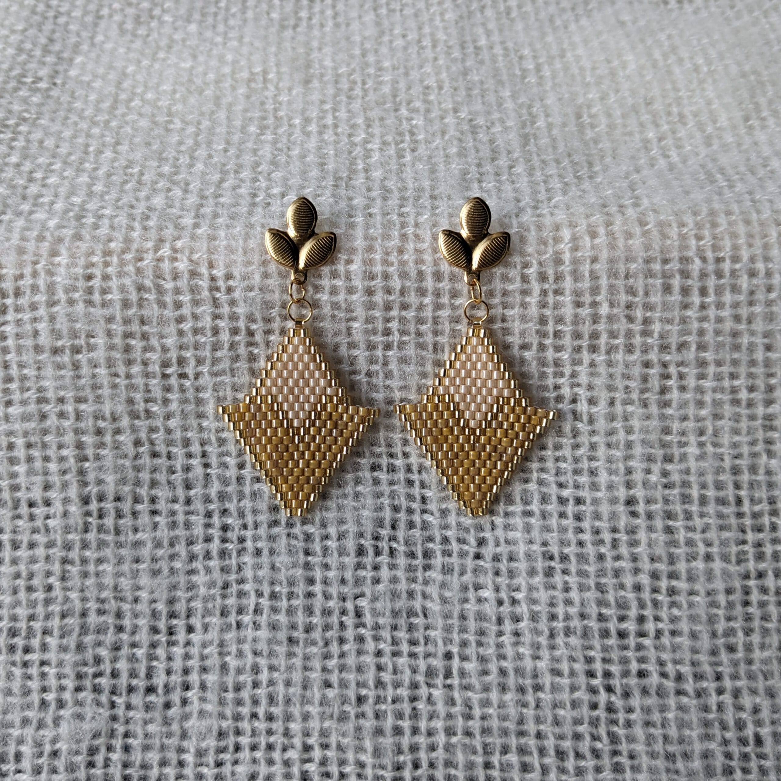 Mooie handgeweven oorbellen gemaakt met de brick stitch techniek. Hierdoor zijn ze uniek in hun soort en mogen ze zeker gezien worden. De oorbellen zijn afgewerkt met een leuke, originele steker in de vorm van blaadjes. Ze zijn licht van gewicht, dus fijn om te dragen.