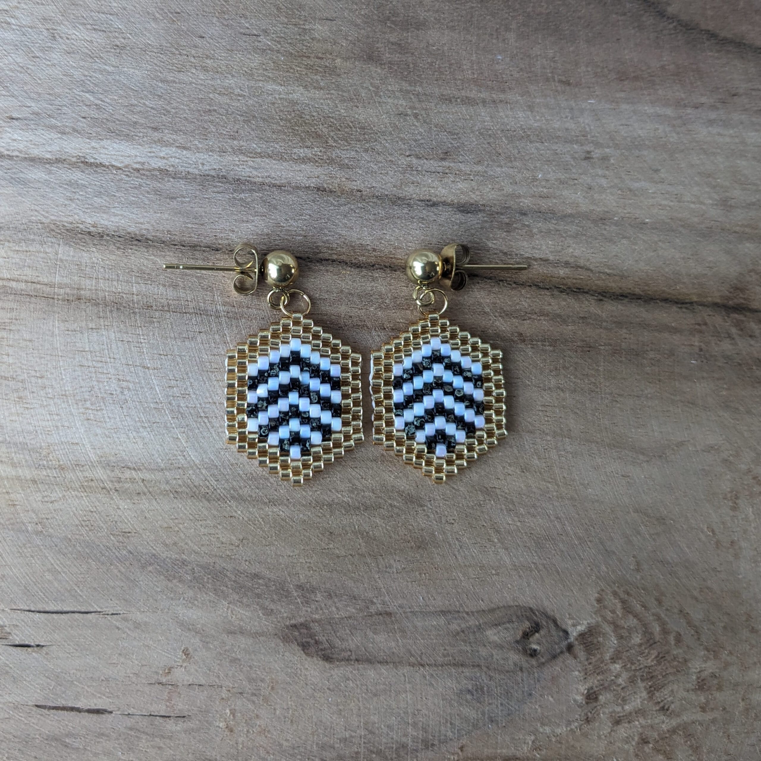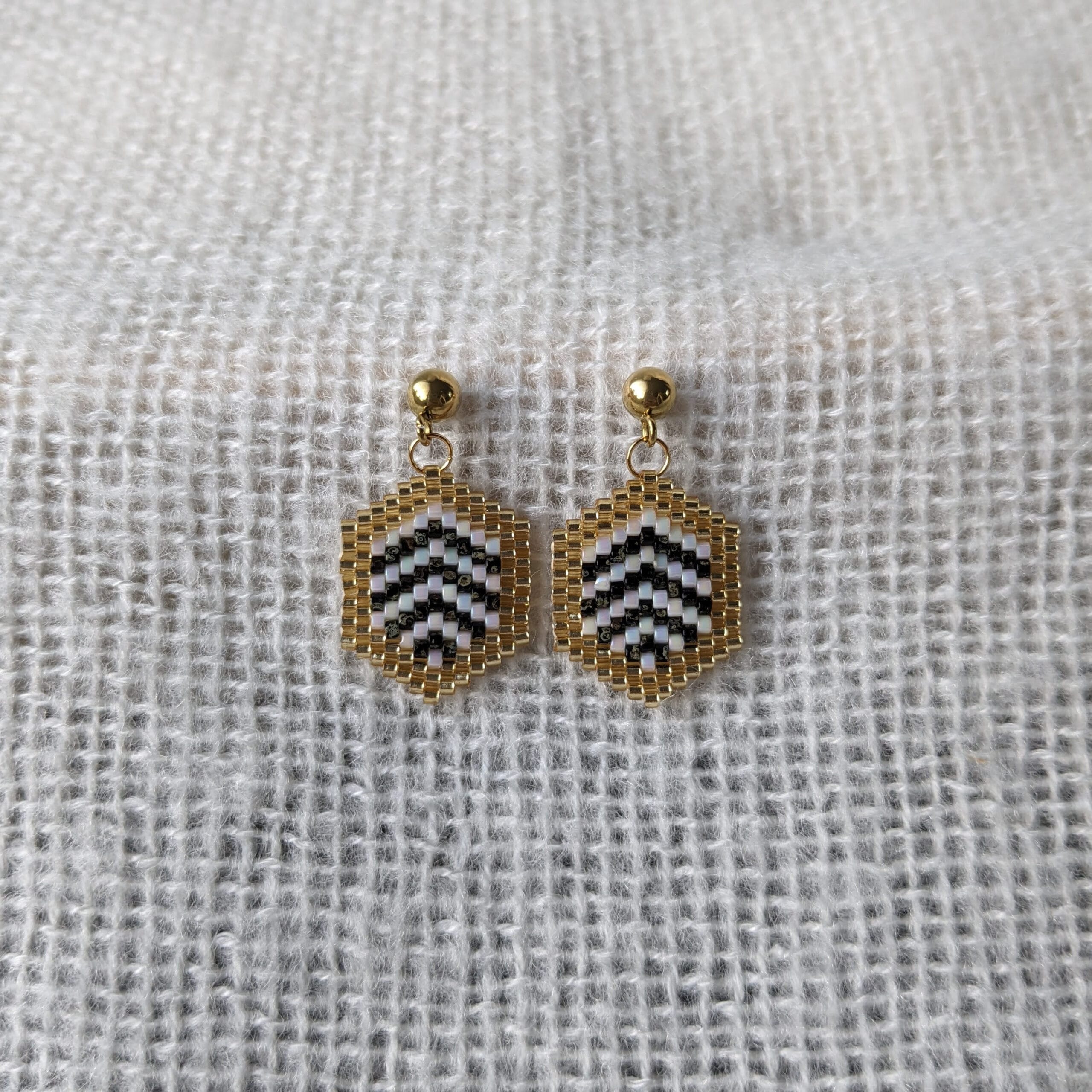 Mooie handgeweven oorbellen gemaakt met de brick stitch techniek. Hierdoor zijn ze uniek in hun soort. De oorbellen zijn afgewerkt met een eenvoudig rond knopje. Ze zijn licht van gewicht, dus fijn om te dragen.